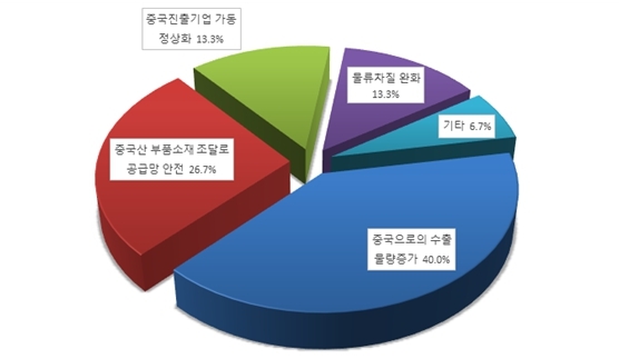 | 위 질문에 긍정적 효과가 가장 크게 기대되는 부분이 무엇인지에 대한 물음에는 ‘중국으로의 수출물량 증가’(40.0%), ‘중국산 부품소재 조달로 공급망 안전’(26.7%), ‘중국진출기업 가동 정상화’(13.3%), ‘물류차질 완화’(13.3%) 순으로 나타났다. <‘기타’(6.7%)>