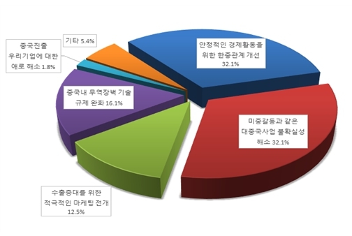 | 중국의 리오프닝을 우리기업의 기회로 활용하기 위해 필요한 과제로는 ‘안정적인 경제활동을 위한 한중관계 개선’(32.1%), ‘미·중갈등과 같은 대중국사업 불확실성 해소’(32.1%), ‘중국내 무역장벽·기술규제 완화’(16.1%), ‘수출증대를 위한 적극적인 마케팅 전개’(12.5%), ‘중국진출 우리기업에 대한 애로 해소’(1.8%) 순으로 나타났다. <‘기타’(5.4%)>