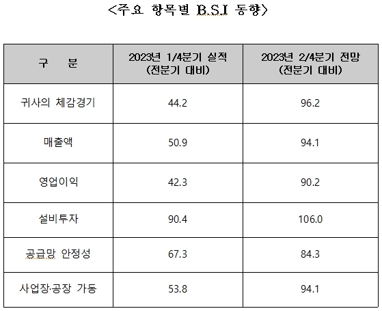 2023년 2/4분기 BSI지수가 큰 폭으로 상승했으나, 여전히 우리 기업들이 예상하는 경기전망은 지난 분기보다 ‘호전’될 것이라고 답한 기업보다 ‘악화’될 것이라고 답한 기업이 더 많았으며, 그 원인을 ‘원자재 가격 상승’, ‘물가·금리 인상’ 등을 주된 이유로 꼽았다.