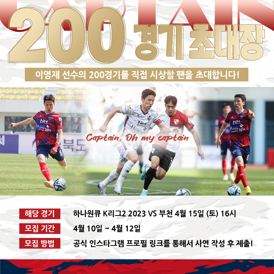 김천상무프로축구단이 4월 10일부터 12일까지 이영재의 프로통산 200경기 출전 기념식에 참여할 팬을 모집한다. 이영재의 프로통산 200경기 출전 기념식은 4월 15일 부천FC전 홈경기에서 진행할 예정이다.