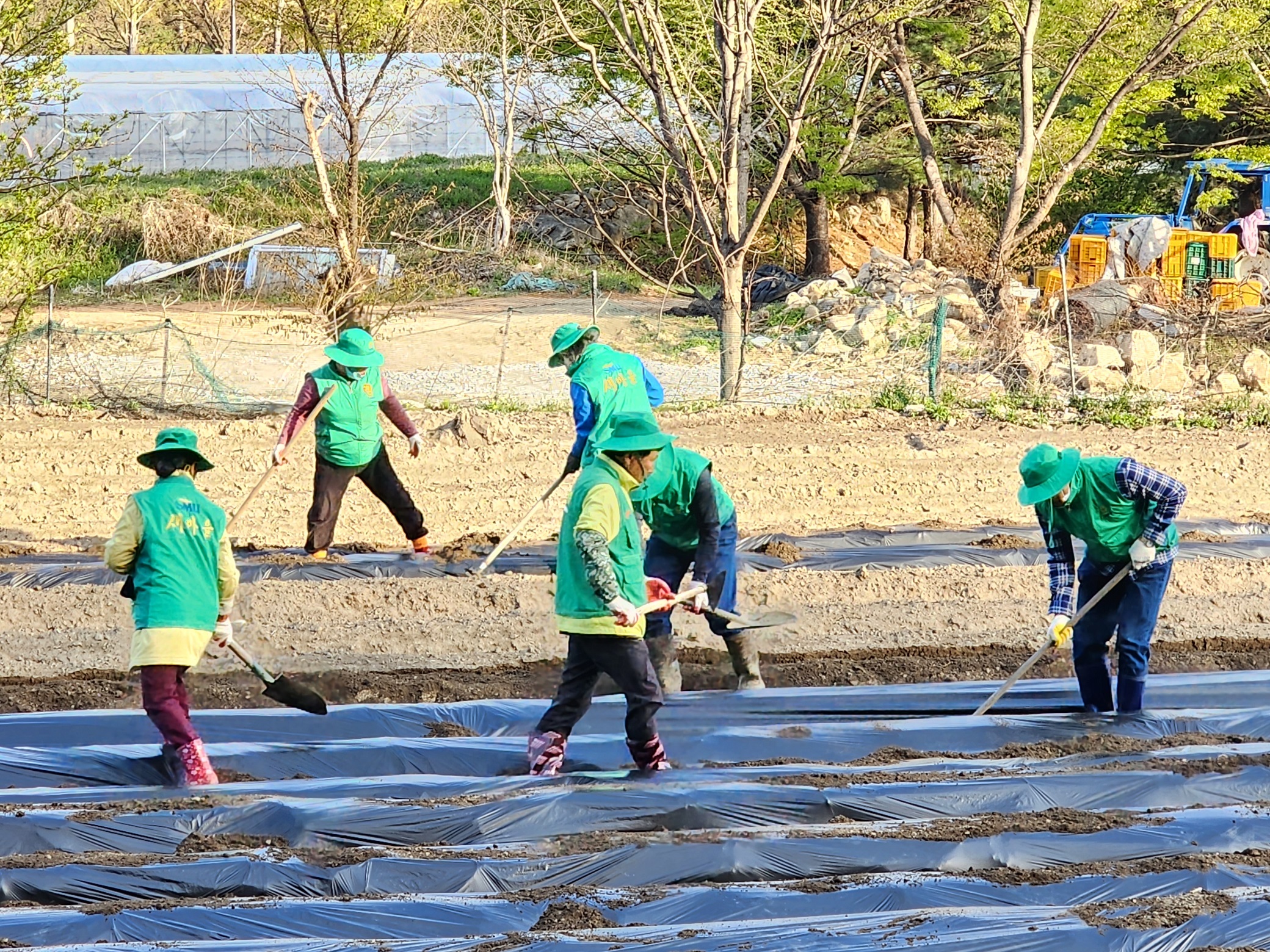 이날 4월 중순임에도 새벽 땅에 서리가 앉을 만큼 갑자기 쌀쌀해진 날씨에도 불구하고 이른 아침부터 많은 인원이 참여하여 추위도 잊은 채 멀칭 작업에 매진했다.