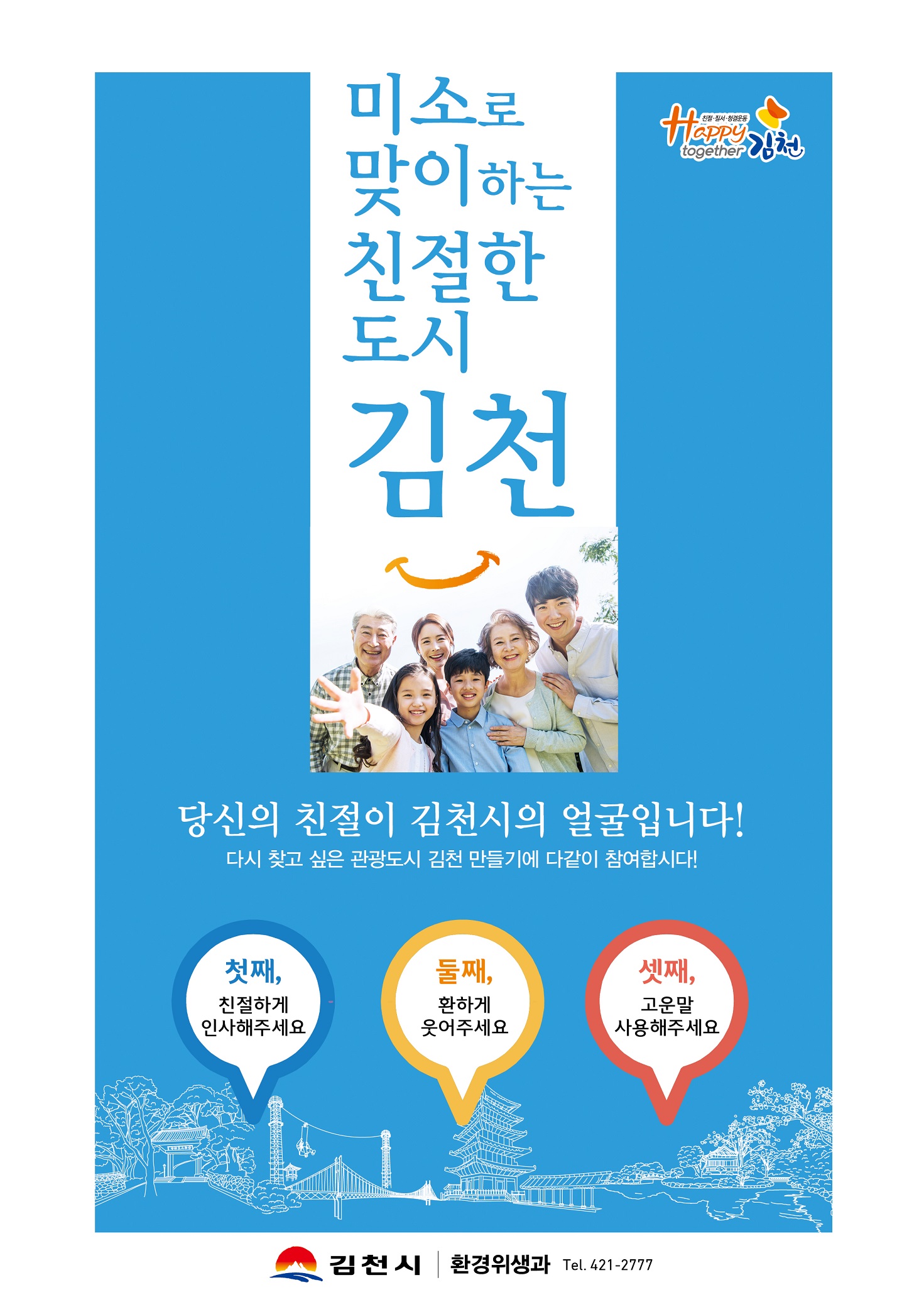 | 김천시(시장 김충섭)는 음식점의 친절도·위생·청결 수준 향상을 위해 시민의식 운동인 『Happy together 김천』 집중과제로 이를 선정하고 적극 추진한다고 밝혔다.