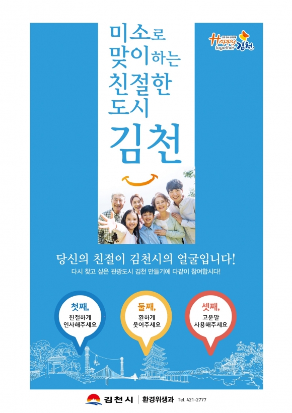 또한 ‘미소로 맞이하는 친절한 도시 김천’이란 강령으로 관련 단체, 영업자, 소비자 식품위생감시원이 함께하는 캠페인도 전개한다. 음식점이 밀집한 부곡 맛고을 거리, 직지사 주변 상가를 대상으로 친절 응대 홍보물을 배부하고 『Happy together 운동』 참여를 독려할 예정이다.