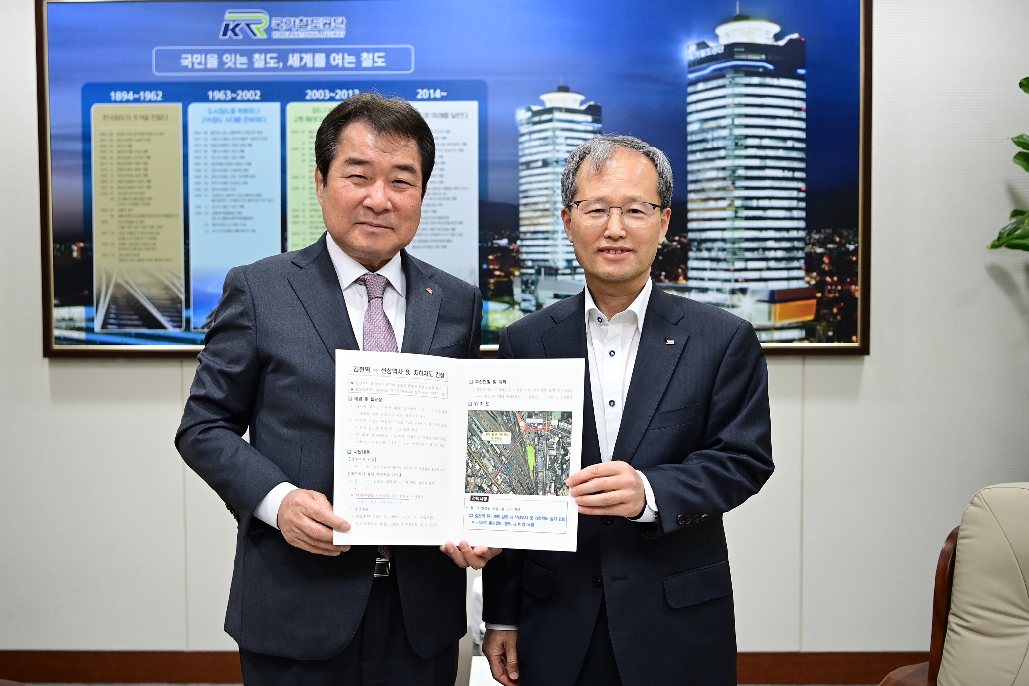 이 자리에서 김충섭 김천시장은 김천시가 구상한 철도사업이 모두 반영 추진된 데에 대해 국가철도공단의 협조와 노고에 감사를 드렸고, 현재 검토 중인 김천역사 증‧개축 사업의 선상 역사화와 양분된 도심의 단일축 형성을 위한 지하차도, 남부‧중부내륙철도 차량 정비기지의 김천시 입지 검토를 요구했다.