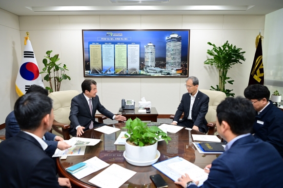 | 김충섭 김천시장은 십자축 철도망 구축의 조기 착수와 철도산업 인프라 확장 지원 요청을 위해 4월 17일 국가철도공단 이사장을 방문 면담했다.