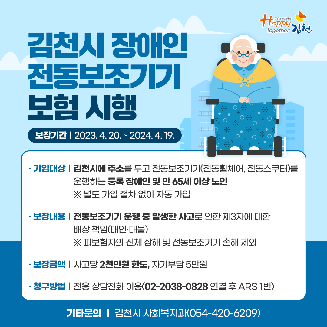 | 김천시(시장 김충섭)는 취약계층 사회안전망 강화를 위해, 관내에 주소를 둔 등록장애인 및 만65세 이상 노인의 전동보조기기(전동스쿠터, 전동휠체어) 운행 중 발생한 사고에 대한 배상책임보험에 가입했다.