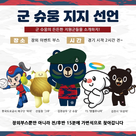 2023 K리그 마스코트 반장선거가 5월 1일부터 14일까지 진행된다. 마스코트 반장선거 본투표를 하루 앞두고 김천은 홈경기에서 사전 홍보를 진행할 예정이다. 슈웅이네 PX(매점)에서는 일일 PX병으로 ‘군슈웅’을 운영한다. Kick 어플리케이션 설치 후 PX에서 인증 시, 선착순 500명에게 한정판 건빵을 증정할 예정이다.