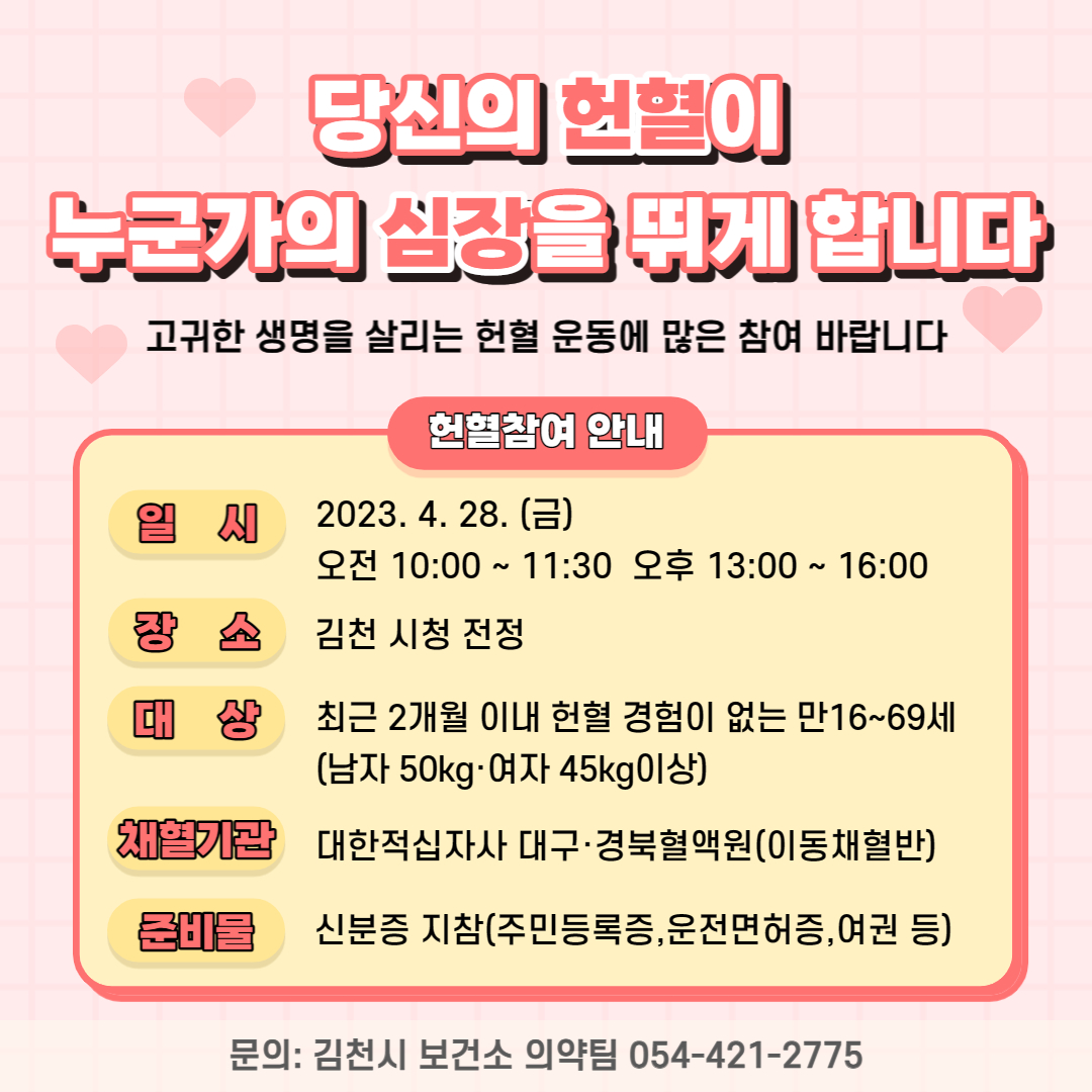 이번 헌혈 운동은 4월 28일 오전 10시부터 오후 4시까지(오전 접수 마감 11:30, 점심시간 12:00~13:00) 시청 전정에서 진행된다.