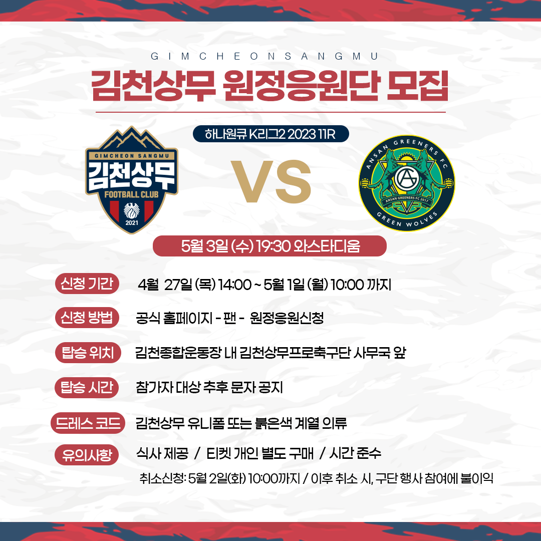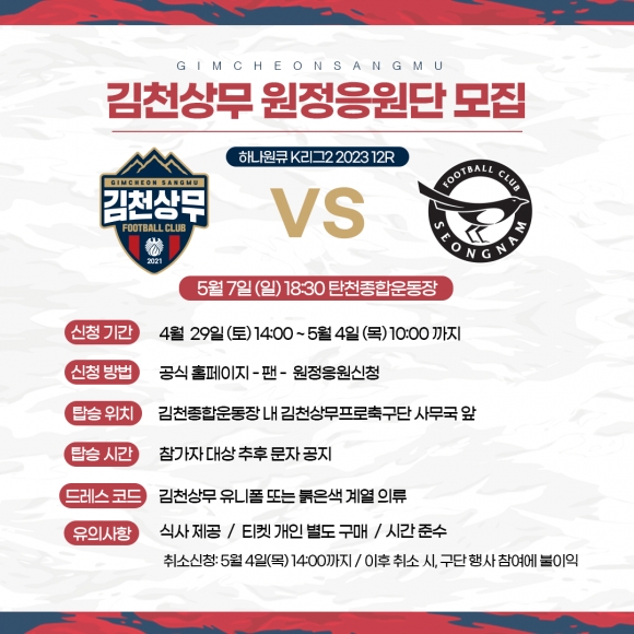 한편, 안산그리너스전 원정경기 티켓은 티켓링크, 성남FC전 원정경기 티켓은 인터파크티켓을 통해 예매할 수 있으며 원정버스 관련 문의사항은 김천상무 사무국 유선문의(070-4105-4050)를 통해 가능하다. |