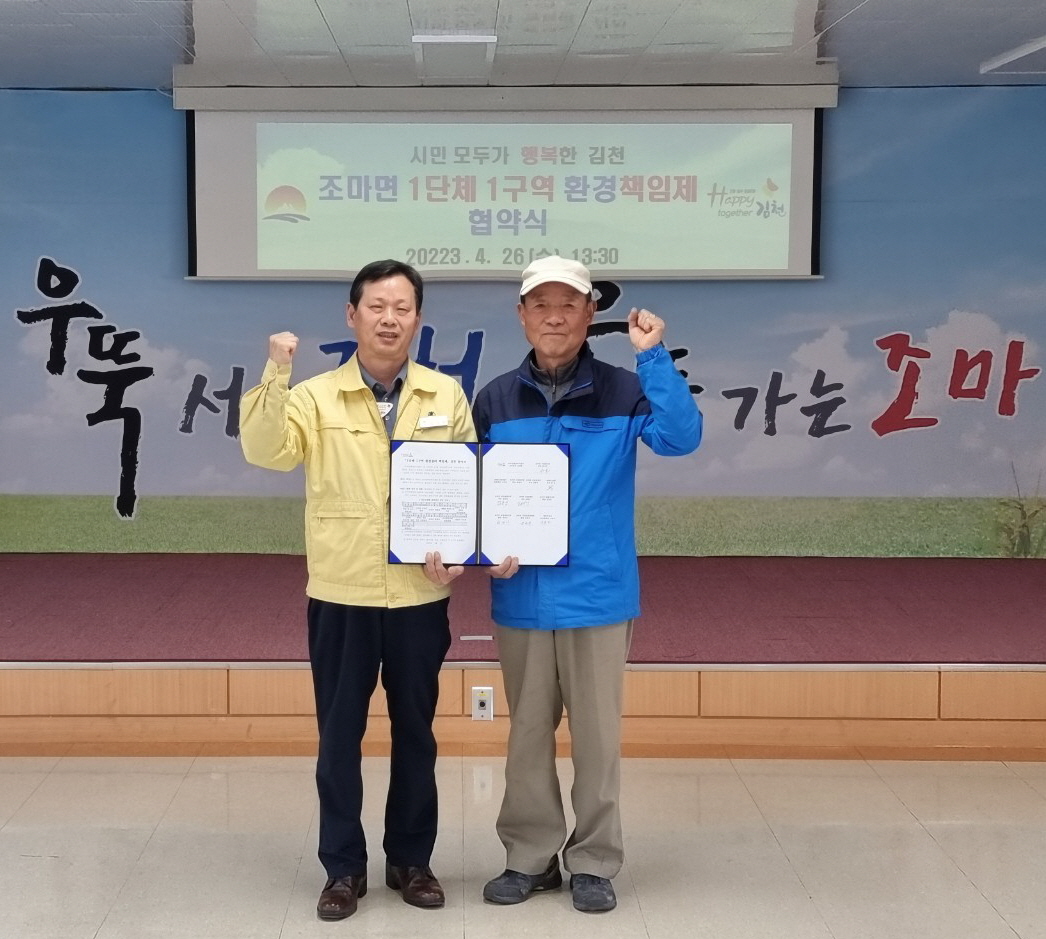 | 조마면(면장 김성환)은 지난 4월 26일 관내 11개 단체와 「1단체 1구역 환경 정비 책임제」 협약식을 했다. 이번에 실시하는 「1단체 1구역 책임제」는 「Happy together 김천 운동」과 연계한 ‘청결한 도시 김천’ 구현을 위해 각 읍면동 관변단체와 환경정비 책임제 협약을 추진하는 제도이다. 각종 현안 사업에 봉사하는 관변단체가 직접 관내 취약 구역을 담당함으로써 지역사회의 환경문제를 해소하고 시민 스스로 청소할 수 있는 ‘청소 붐’ 문화를 조성하는 것에 목적을 두고 있다. 행정복지센터 2층에서 진행된 이날 협약식에서 단체별 조마면 환경 정비 취약지역을 논의하고 선정했으며, 이후 선정한 지역을 관리하는 협약을 조마면과 체결했다.
