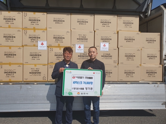 | 김천시(시장 김충섭)는 지난 4월 26일 (주)정다운 사람들(대표 양기환)로부터 마스크 78,000장(시가 3,120만 원) 상당의 물품을 전달받았다고 밝혔다.
