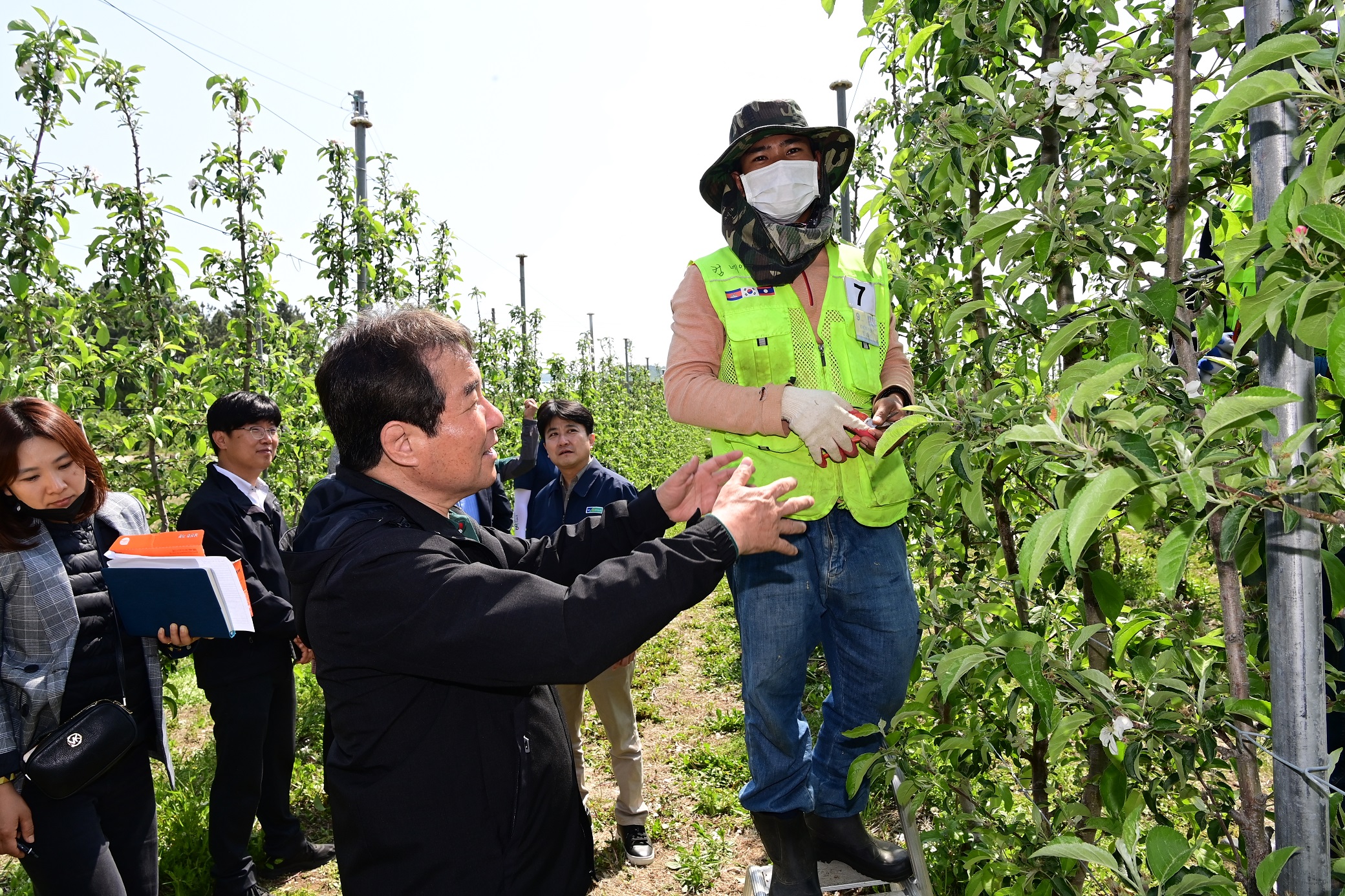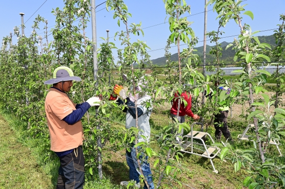 | 김천시(시장 김충섭)는 지난 3월 입국해 근로 중인 공공형 계절 근로사업 참여자 중 캄보디아 계절 근로자 8명이 투입된 아포읍 사과 농가를 찾아 작업 현장을 점검하고 계절 근로자를 격려했다. 지난 3월 27일 입국한 캄보디아 계절 근로자 52명 중 2개 조로 구성된 8명은 이날 오전 7시부터 17시(점심시간, 휴식 시간 포함)까지 사과 적과 작업에 투입되었다.