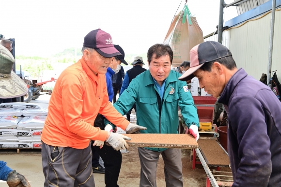 | 김천시(시장 김충섭)는 5월 1일 아포읍 의리 장광배(만 75세)씨의 육묘장을 방문해 지역 주민들과 함께 볍씨 파종을 작업을 도우며 현장에서 다양한 의견을 듣는 소통의 시간을 가졌다.