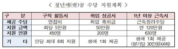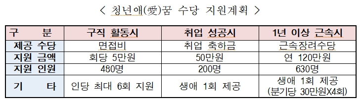 일하려는 의욕을 가진 청년을 위한 단계별 패키지형 지원정책인 이번 사업은 취업 단계별로 △면접비(구직 활동 시) △취업 축하금(취업 성공시) △근속장려수당(1년 이상 근속시)으로 구성됐다.
