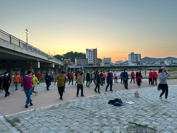| 김천시 보건소는 지난 5월 1일부터 10월 31일까지 감천교 둔치(황산폭포 인근)에서 전 연령층에 걸쳐 신체활동이 위축된 시민들을 위해 파워워킹 건강 교실을 시작했다.