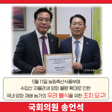 이에 송언석 의원은 농림축산식품부 김인중 차관을 만나 수입산 저율관세 양파 물량 확대에 대한 국내 양파 농가들의 우려를 전달하고, 양파 농가의 우려를 불식시키기 위한 정부의 적극적인 조치를 요구했다.