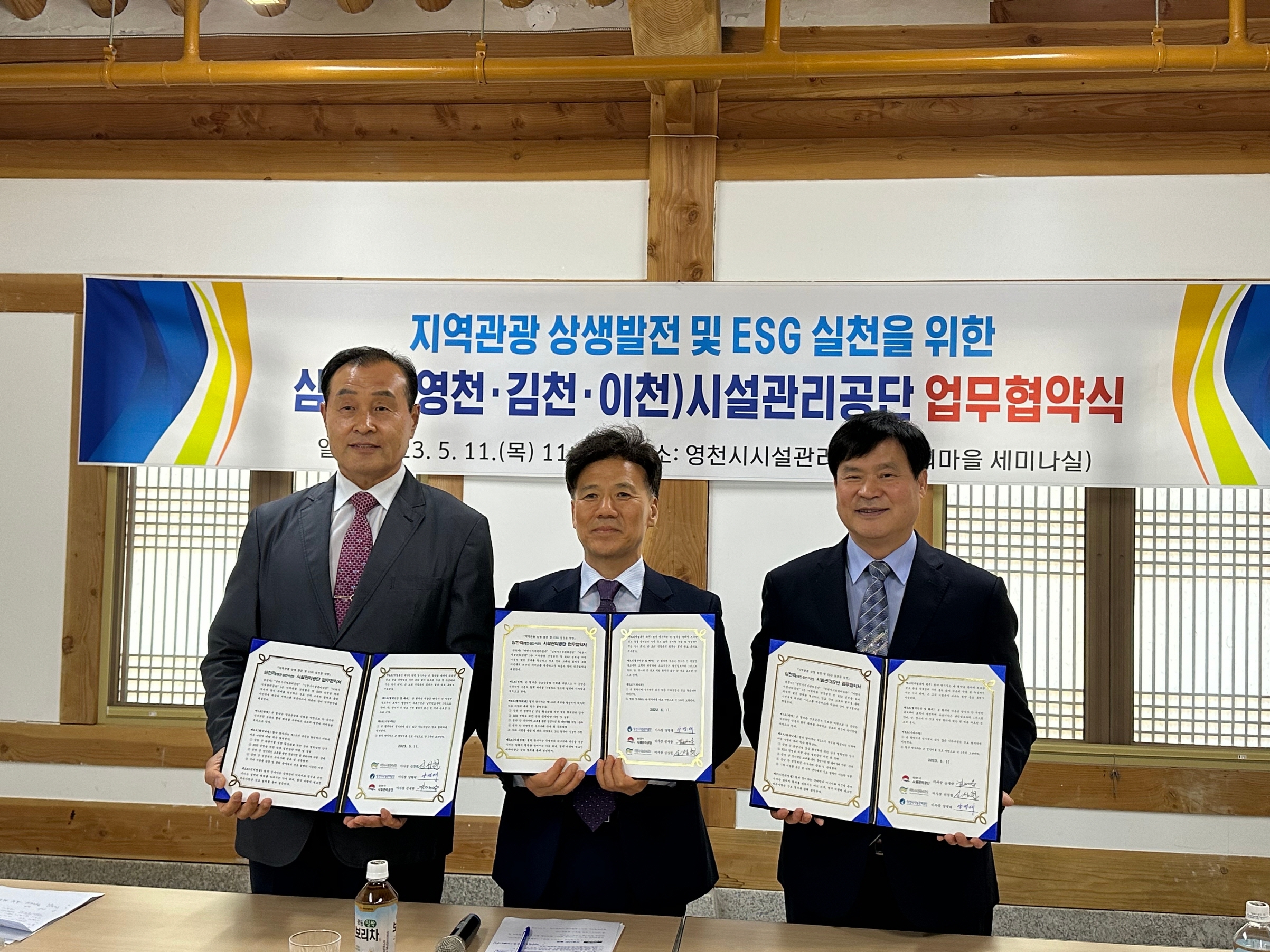 | 김천시시설관리공단(이사장 김재광)은 지난 5월 11일 영천한의마을 세미나실에서 영천시시설관리공단(이사장 양병태), 이천시시설관리공단(이사장 신성현)과 지역관광을 상생 발전시키고 관광객들에게 최상의 서비스를 제공하기 위해‘삼천리 업무협약(MOU)’을 체결했다.