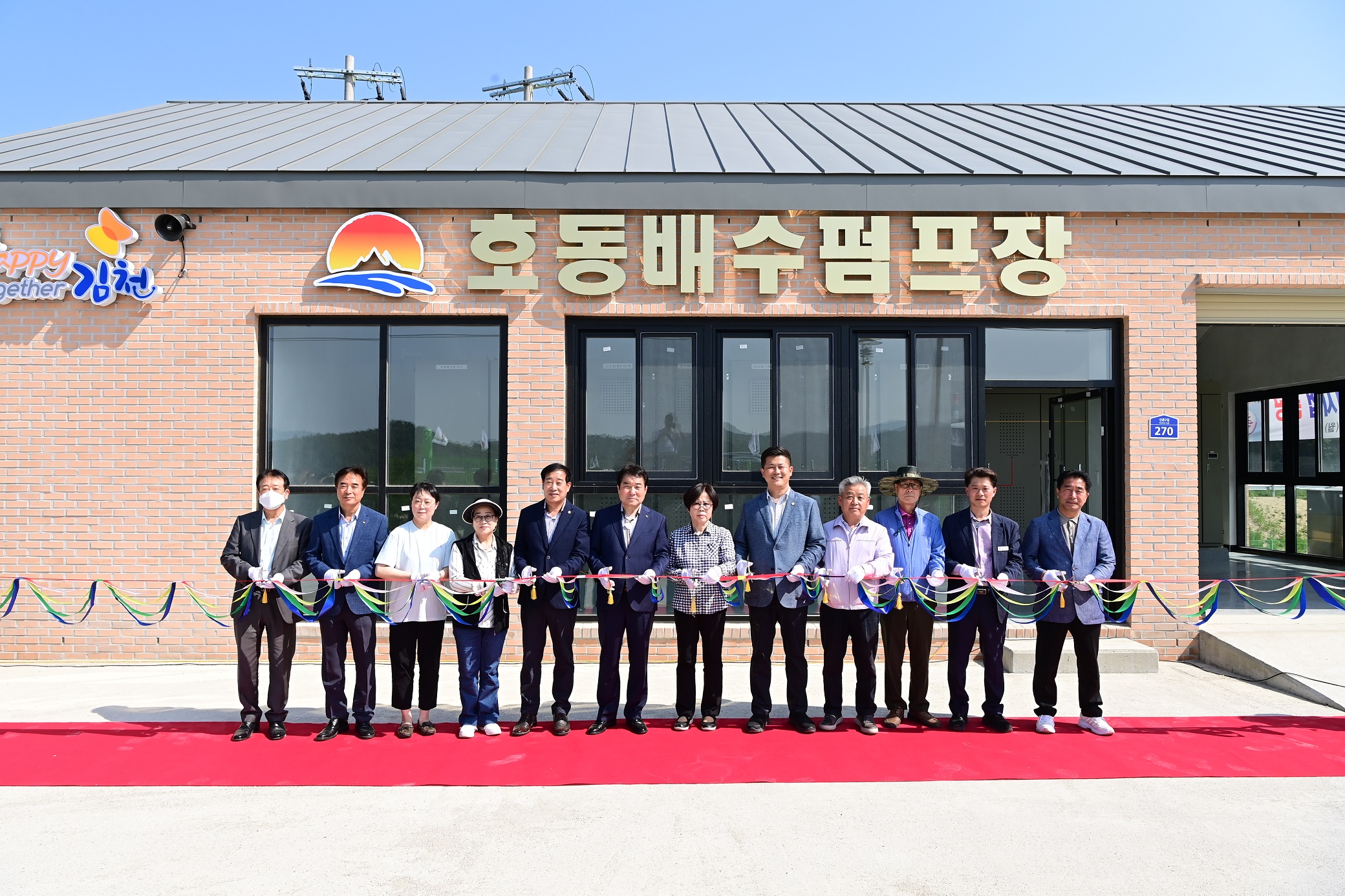| 김천시(시장 김충섭)는 5월 15일 농소면 신촌리 호동배수펌프장에서 지역구 시의원, 수혜주민들이 참석한 가운데 호동지구 배수개선사업 준공식을 개최했다.