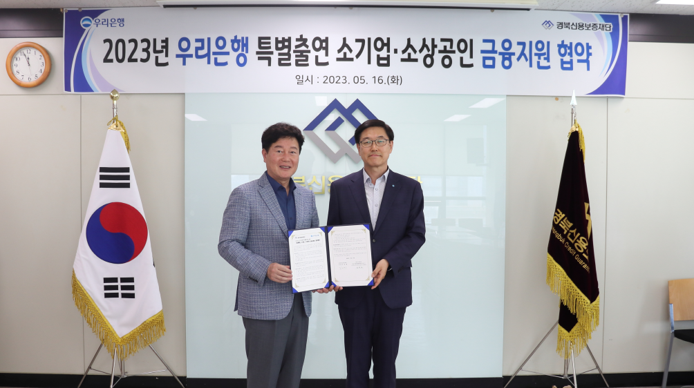 | 경북신용보증재단은 5월 16일 우리은행과 경기침체로 어려움을 겪고 있는 소상공인을 지원하기 위해 ‘2023년 우리은행 특별출연 금융지원 업무협약’을 체결했다고 밝혔다.