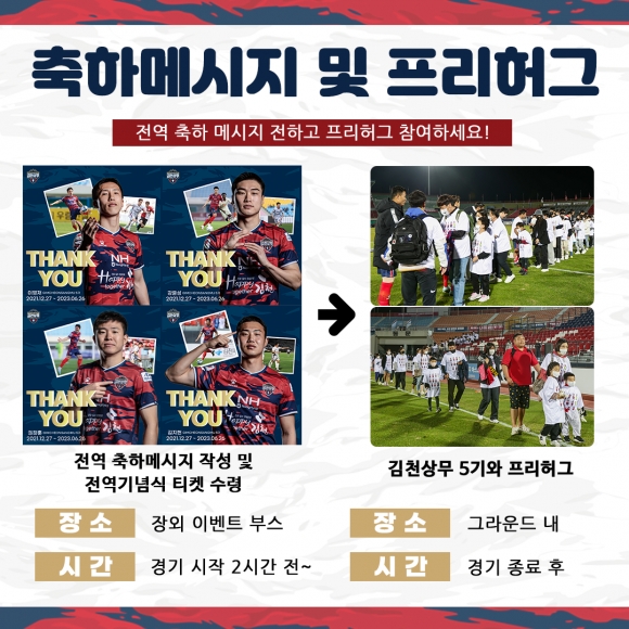 김천상무는 김천 5기 전역기념식 콘셉트로 경기 전부터 경기 후까지 팬들과 함께한다. 경기 전 전역기념 이벤트 부스에서는 사진전 전시와 함께 축하 메시지 작성 이벤트를 실시한다. 축하 메시지 작성 팬 선착순 200명에게 한정판 전역기념 티켓을 증정하며 티켓 소지자에 한해 경기 후 전역기념식 프리허그 행사에 참여할 수 있다.