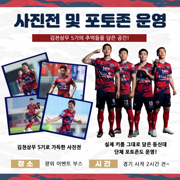 | 전역기념 포토존도 운영된다. 김천 5기 단체 포토존을 비롯해 선수 개별 포토존도 운영한다. 실제 선수 신장과 동일한 크기의 등신대를 설치해 선수와 함께 추억을 남길 수 있도록 준비했다. 선수단 워밍업 시에는 찐 팬 대상 하이파이브 및 선수와 함께 단체사진 촬영 이벤트를 진행한다. 하프타임에는 전역 선수 대상 퀴즈 이벤트를 실시할 예정이다. 경기 후에는 전역기념 영상 상영, 프리허그 이벤트, 사전 모집한 사연을 바탕으로 애장품 전달 등 김천 5기 선수들과 팬이 마지막으로 함께할 수 있는 행사를 진행한다.