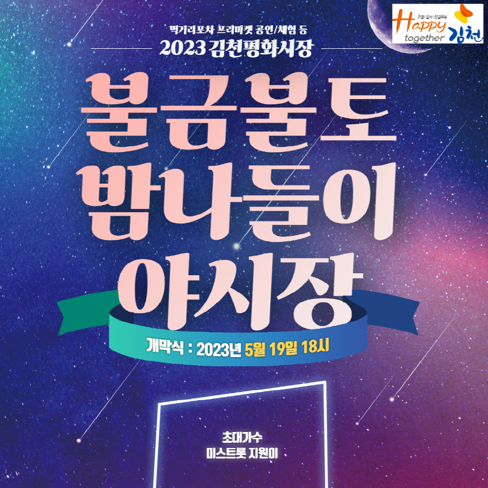 | 김천시(시장 김충섭)는 오는 5월 19일 평화시장 일원에서 ‘2023 평화시장 불금불토 밤 나들이 야시장’을 개장한다. 야시장은 5월 19일 시작으로 6월 10일까지 더운 여름철을 제외하고 9월 1일부터 9월 23일까지 총 8주간 매주 금요일과 토요일 오후 6시부터 밤 10시까지 운영된다.