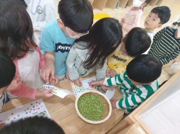 수확한 완두콩을 교실로 가져와 완두콩 따기, 완두콩 까기, 완두콩 촉감 놀이 등 다양한 놀이가 이루어졌다. 꽃잎반 이모원생은“껍질 밖은 까끌까끌한데 속은 부드러워요.”“콩이 많이 들어 있어요.” 열매반 김모원생은 “이걸로 음식 해 먹으면 더 맛있을 것 같아요.”라며 텃밭에서 아이들이 직접 키운 완두콩에 애착을 가지는 모습을 보였다.