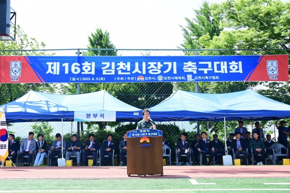 | 이날 대회는 내빈 소개, 국민의례, 오방수 김천시 축구협회 실무 부회장의 개회 선언을 시작으로, 김충섭 김천시장의 대회사, 정용필 김천시 축구협회장의 환영사, 송언석 국회의원, 이명기 시 의장, 최한동 체육회장의 축사 순으로 행사가 진행되었다.