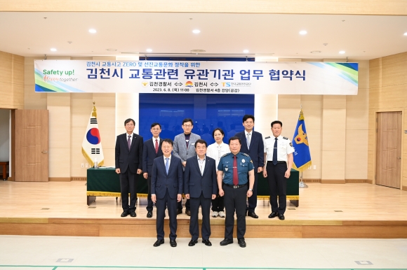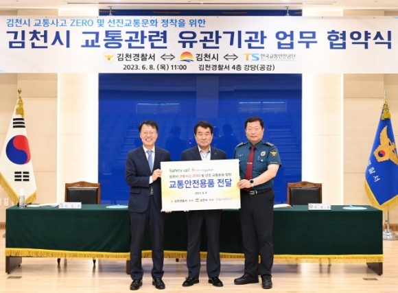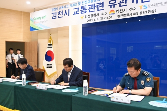 | 김천시(시장 김충섭), 김천경찰서(서장 최병부), 한국교통안전공단(이사장 권용복)은 6월 8일 김천경찰서 4층 강당(공감)에서 “Safety up! happy together”를 주제로 교통사고 예방 업무협약을 체결했다.
