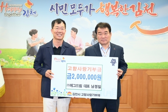 | 농소면 ㈜에그드림(대표 남정일)은 지난 6월 8일 고향사랑기부제의 안정적인 정착과 기부를 통한 애향심 고취를 위해 김천시에 고향사랑기부금 200만 원을 냈다.