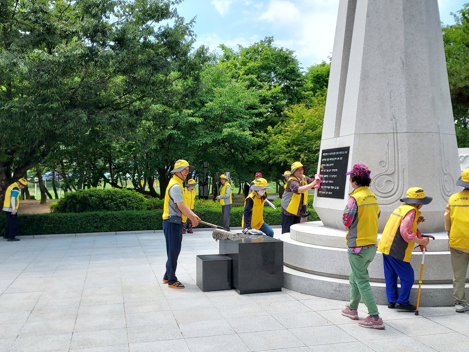| 대한노인회 김천시지회(지회장 이부화) 소속 대신금류1차봉사단(단장 강희만)은 6월 호국보훈의 달을 맞아 김천시 신음동 강변조각공원 내 위치한 6·25참전용사 선양비를 5일 방문하여 봉사활동을 펼쳤다.