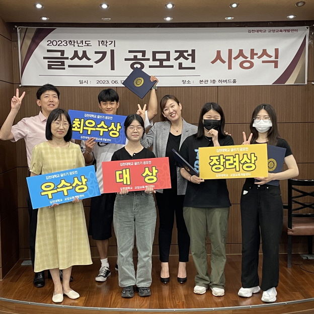 |  | | | ⓒ 김천내일신문 | | 김천대학교(총장 윤옥현) 교양교육개발센터(센터장 송희원)에서 교양필수 교과인 ‘교양글쓰기’와 비교과프로그램인 ‘자기표현력강화프로그램: 글쓰기(지도교수 송대헌)’의 성과 확산을 목적으로 글쓰기 공모전을 진행하여 13일 시상식을 가졌다고 밝혔다.
