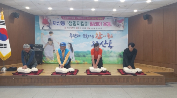이날 교육에는 자산동 새마을회(회장 심재수, 권오현) 회원 20여 명이 참여하여 심폐소생술, 하임리히법, 자동제세동기 사용법 등을 교육했으며 지난 5월에는 통장협의회, 자유총연맹 회원 60여 명이 교육을 수료했다.