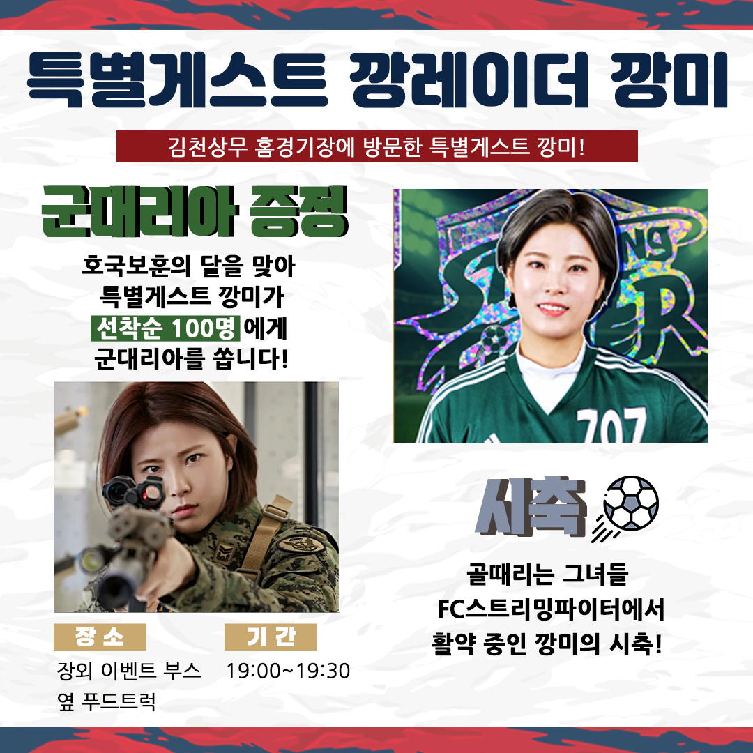 김천상무는 이번 홈경기에서 특전사 707 특수임무단 출신 여성 예비군소대장 강은미(깡미)를 초청한다. 깡레이더 깡미는 김천상무 홈경기 장외 이벤트 구역에서 팬들에게 군대리아를 증정할 예정이다. 경기 시작 전에는 시축을 진행한다.