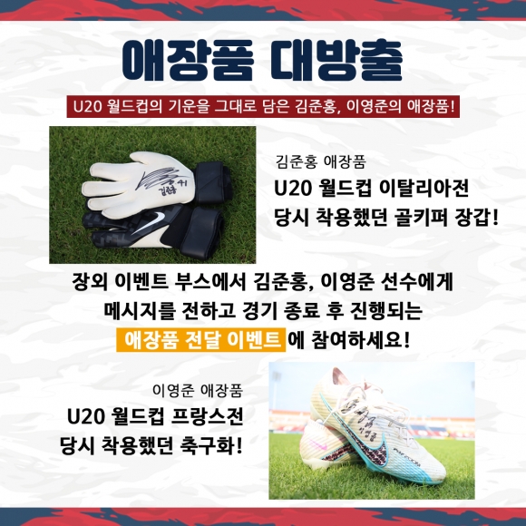 장외 부스에서는 U20 월드컵 4강 진출의 주역 김준홍, 이영준에게 ‘축하 메시지 작성’ 이벤트도 진행한다. 포스트잇을 통해 축하 메시지를 받고 경기 종료 후 선수가 직접 추첨할 예정이다. 김준홍, 이영준이 U20 월드컵에서 직접 착용한 골키퍼 장갑, 축구화를 팬에게 증정할 예정이다.