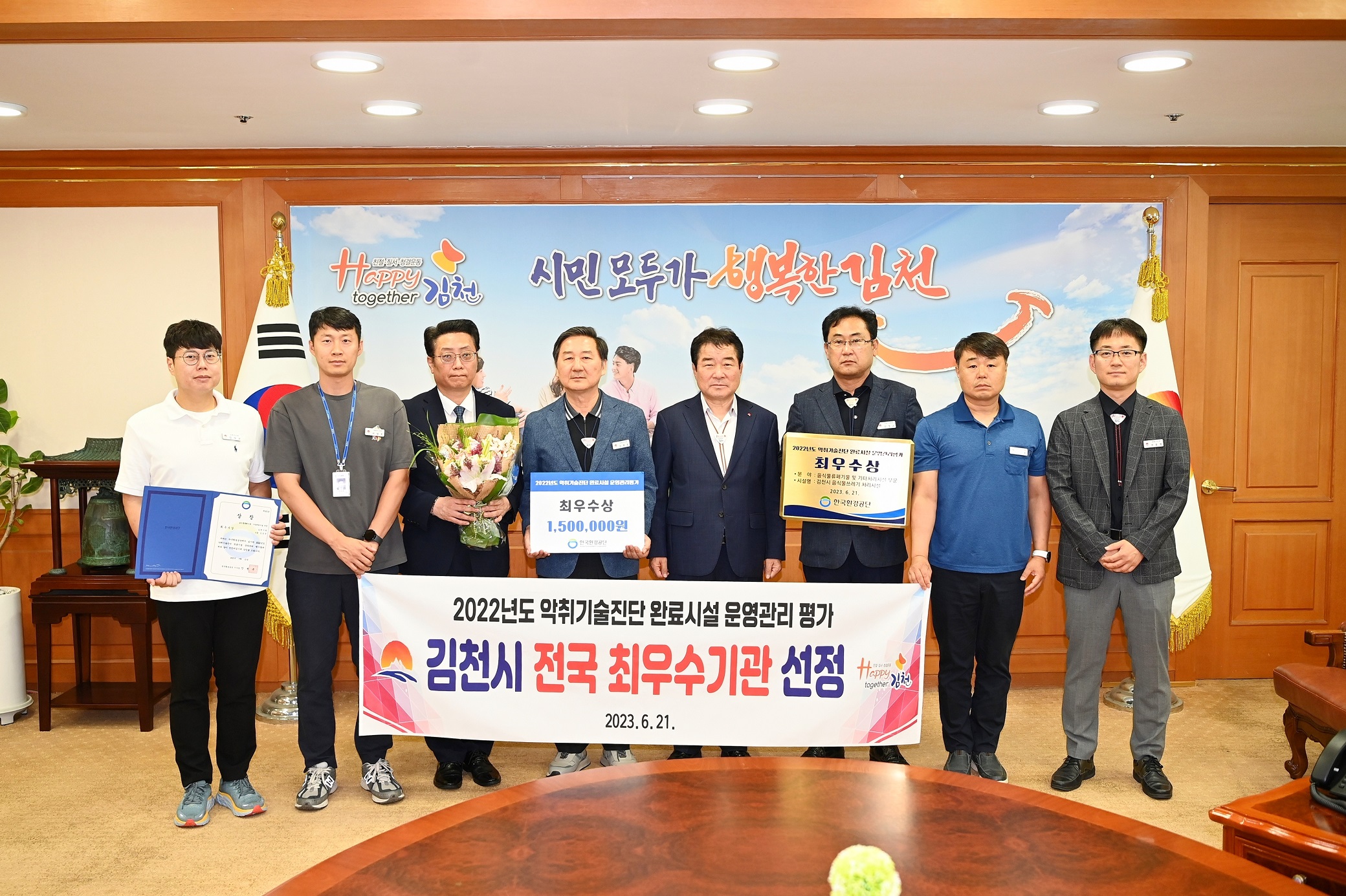 | 김천시는 6월 21일 한국환경공단이 주관하는 “2022년도 악취 기술 진단 완료 시설 운영관리 평가”에서 전국에서 가장 뛰어난 관리능력을 인정받아 최우수상을 수상했다.