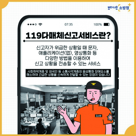 다매체 신고 서비스는 신고자와 119상황요원 간 영상통화는 물론, 문자나 앱에 의한 신고가 가능해 외국인이나 청각장애인 등 의사소통이 어렵거나 음성통화가 곤란한 경우에도 긴급상황을 전달할 수 있다.