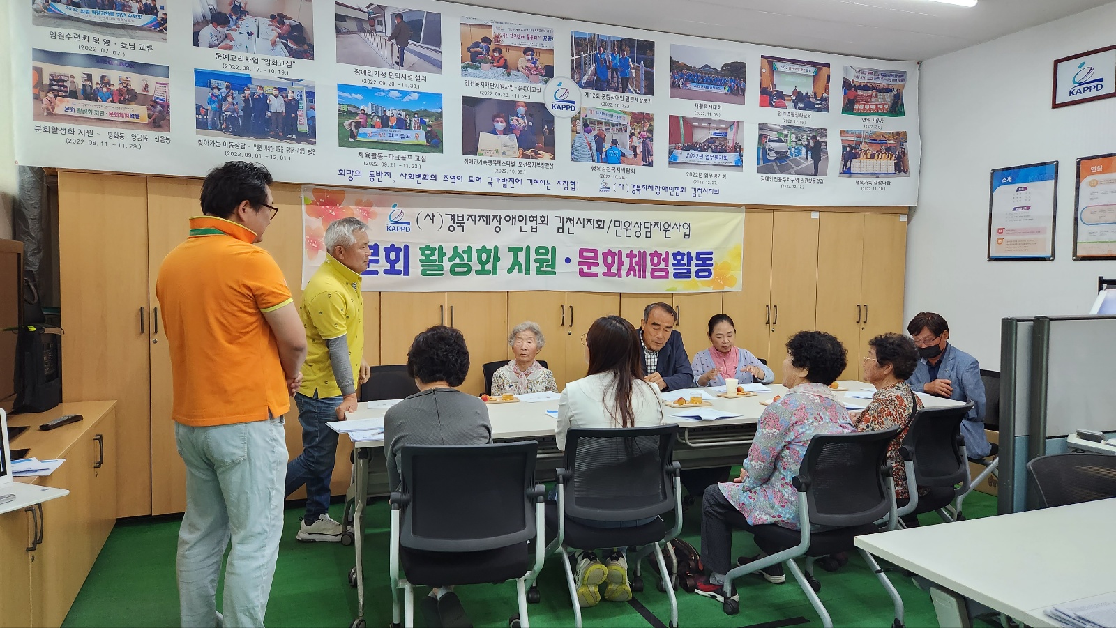 | (사)경북지체장애인협회 김천시지회(지회장 박희만)는 지난 6월 22일 감천면 회원들을 대상으로 분회활성화 지원 사업을 진행했다. 분회활성화 지원 사업은 분회 회원들 간의 정보교류, 화합 및 변경된 복지정보에 대해 잘 알지 못하는 지역 장애인들에게 정보를 제공함으로써 이를 습득하고 지역사회로의 참여를 활성화시키는 계기 마련에 목적이 있다.