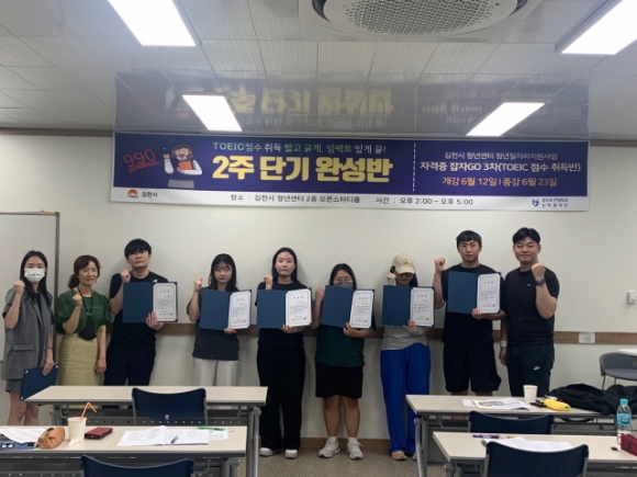 |  | | | ⓒ 김천내일신문 | | 김천시가 지원하고, 경북보건대 산학협력단(총장 이은직)이 운영하는 ‘김천시 청년센터’는 김천 청년 10명을 대상으로 6월 12일부터 6월 23일까지 총 10일, 30시간 동안 운영한 토익 특강이 성공적으로 마무리되었다고 26일 밝혔다.