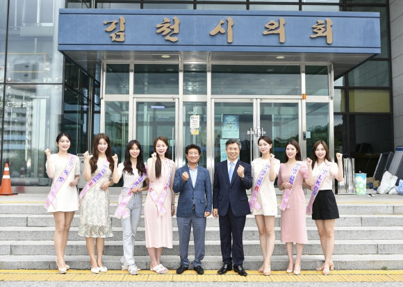 | 2023년 미스 대구·경북으로 선발된 장다연(대구, 쉬메릭 진), 허윤진(경북, 실라리안 진) 등 수상자들이 6월 28일 김천시의회를 방문했다.