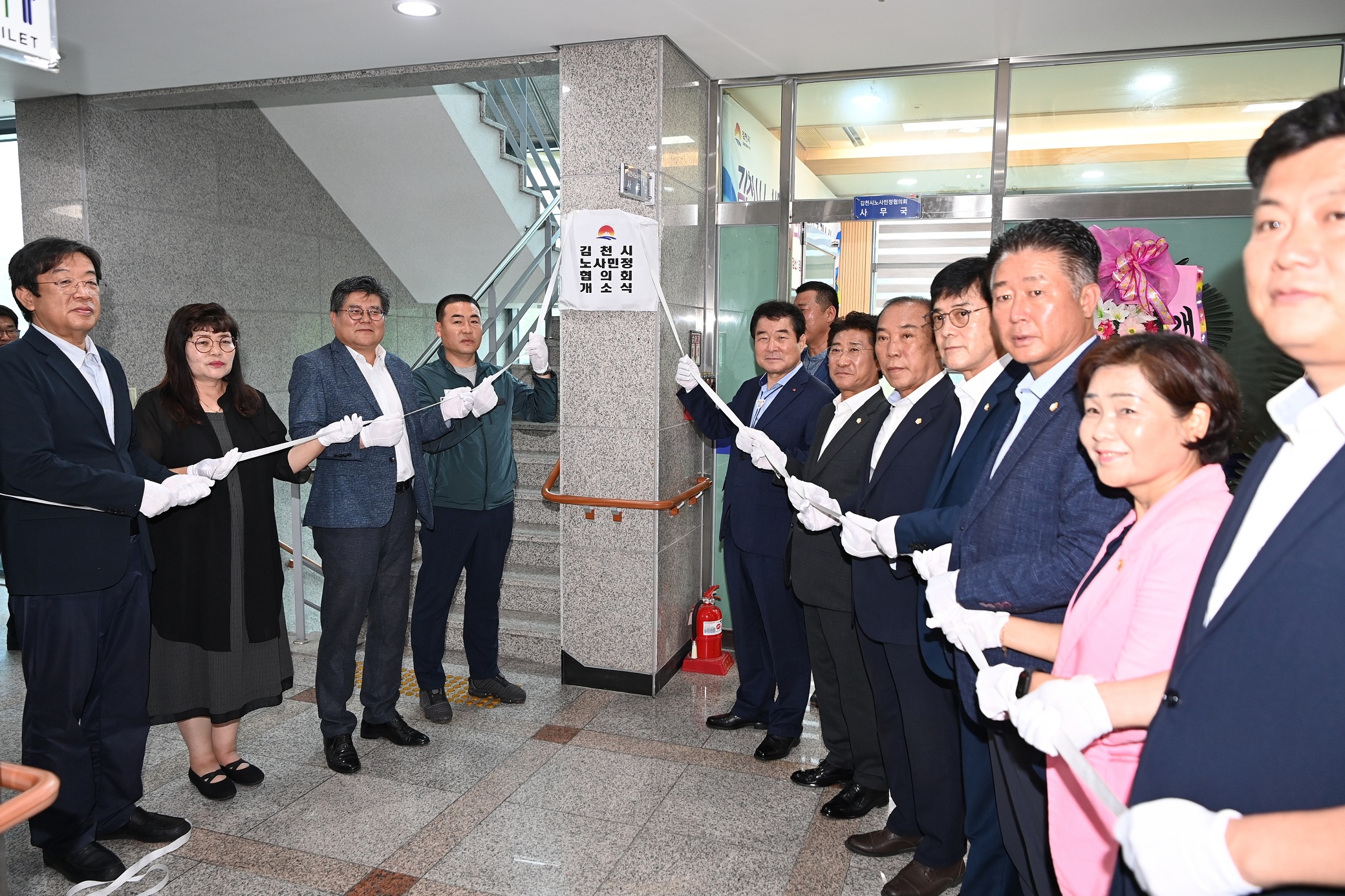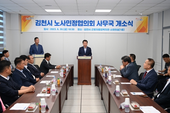 | 김천시 노사민정협의회(위원장 김충섭)는 김천시 근로자종합복지관 1층에 사무국을 마련하고 6월 30일 개소식과 현판식을 통해 새로운 출발을 시작했다.