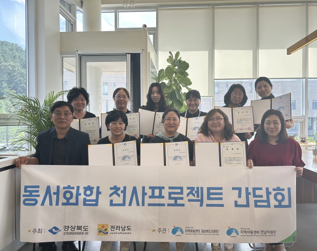 |  | | | ↑↑ 지역아동센터 경상북도지원단 | | ⓒ 김천내일신문 | | 동서화합 천사프로젝트는 2015년부터 전라남도-경상북도 두 도(道) 간의 업무협약 체결로 동서화합 천사프로젝트가 진행되었으며, 각 도(道) 별로 1,004명 빈곤 아동 교차 후원을 시작으로 교류 사업 추진하였다. 2016년에는 경상북도와 전라남도 아동으로 구성된 천사오케스트라를 운영하였고, 2018년 사업을 확대하여 각 도(道) 지원단과 연계하여 동서화합을 위한 지역아동센터 간 교류 캠프를 진행하였다. 2023년에도 각 도(道) 마다 5개소 지역아동센터를 선정하여 교류캠프 및 문화체험과 우수기관방문 등 저소득층 아동 및 문화소외계층 아동을 교차지원, 나눔 문화를 통한 화합과 우의를 증진하는 상생협력 사업으로 진행할 예정이다.