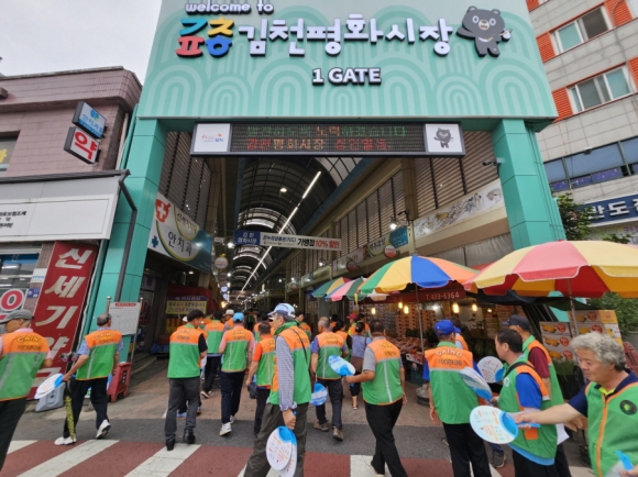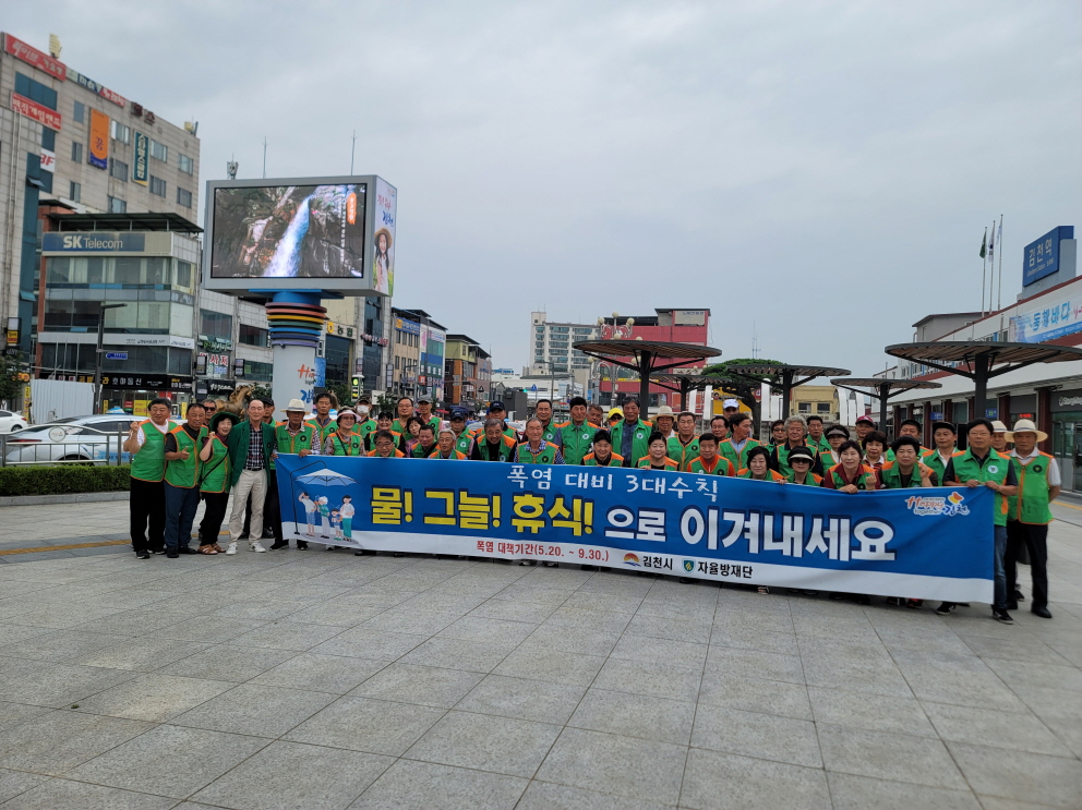 | 김천시 자율방재단장 홍순용을 비롯한 방재단원 70여 명이 7월 7일 김천역 앞에서 모여 평화시장을 행진하는 불볕더위 대비 캠페인을 진행했다.