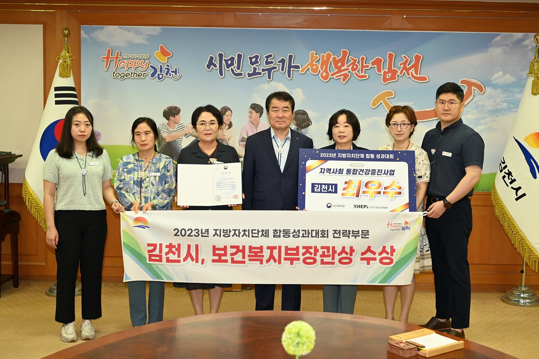| 김천시(시장 김충섭)는 7월 7일 보건복지부에서 주관하는 2023년 지방자치단체 합동 성과대회에서 “2023년 지역사회 통합건강증진사업 전략 부문” 우수 지자체로 선정되어 보건복지부 장관상을 받았다.