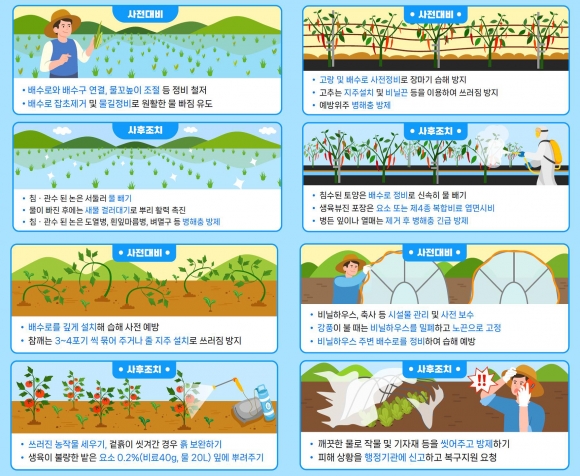 벼는 배수로 잡초 제거 및 물길 정비로 침수가 되지 않도록 해야 하며, 채소를 비롯한 밭작물도 고랑 및 배수로를 정비해 습해를 예방하고 작물이 쓰러지지 않도록 줄 지주를 설치하고 병해충 예방을 위해 사전에 방제해야 한다.