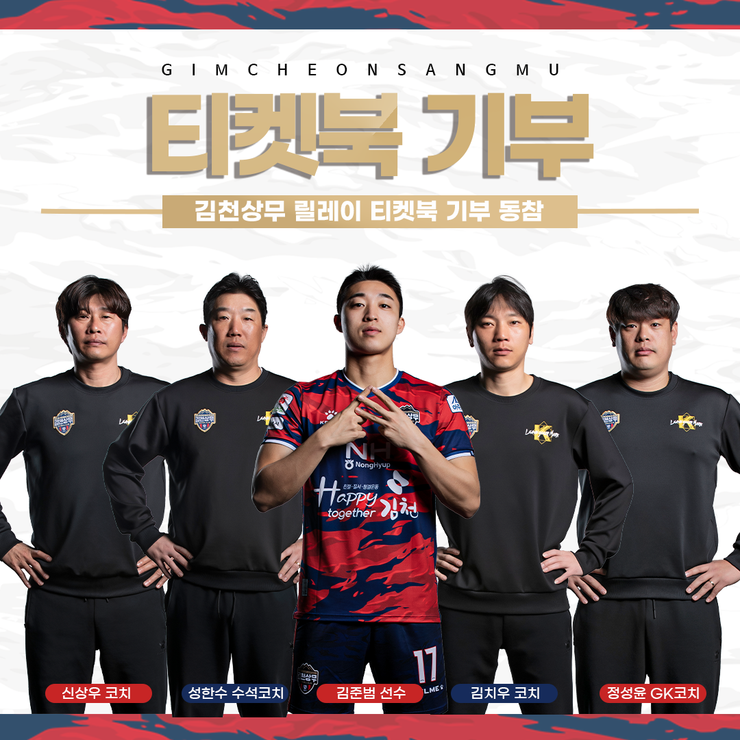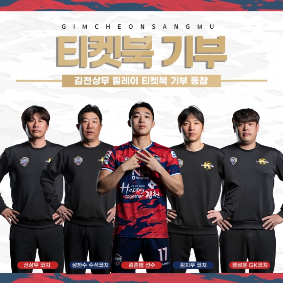 김천상무프로축구단이 7월 19일 김천종합운동장에서 ‘하나원큐 K리그2 2023’ 충남아산FC와 홈경기를 치른다. 이날 홈경기에 앞서 김천상무 코치진(성한수 수석코치, 신상우 코치, 정성윤 GK코치, 김치우 코치)을 비롯해 김준범이 릴레이 티켓북 기부에 동참했다.