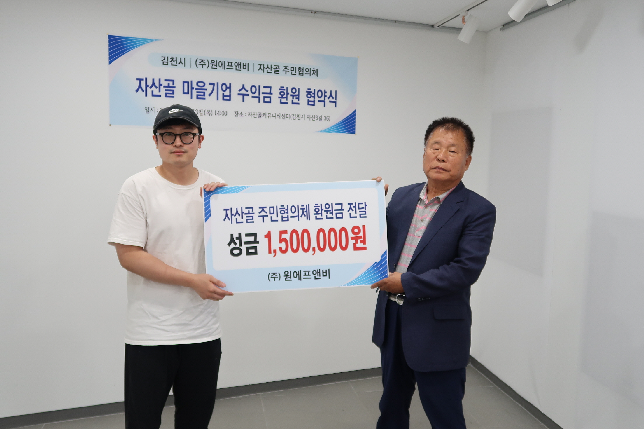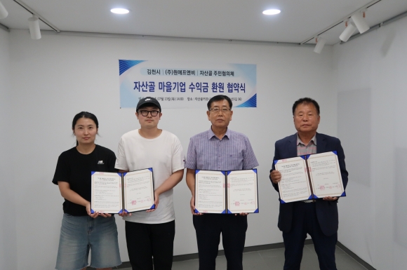 | 지난 7월 13일 김천시는 ㈜원에프앤비, 자산골 주민협의체와 마을기업 수익금 환원 협약식을 개최했다고 밝혔다.