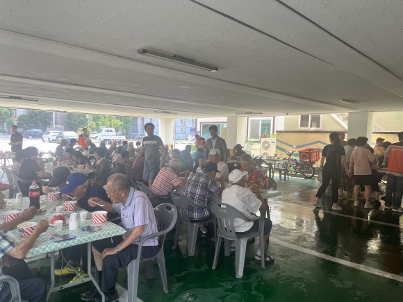 | 김천시 황금시장 상인회는 지난 7월 21일, 중복을 맞아 황금시장 주변 경로당 어르신을 초청해 삼계탕, 과일, 음료를 제공했다.