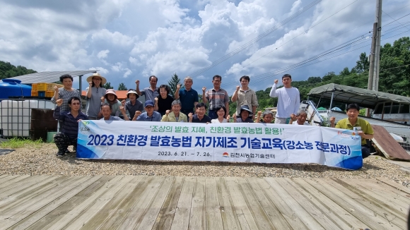 | 김천시(시장 김충섭)는 6월 21일부터 7월 26일까지 강소 농가 20호를 대상으로 중소규모 농업 경영체 경쟁력 향상을 위한 ‘친환경 발효농법 자가 제조 기술교육’을 6회 교육했고, 7월 26일 교육생 농가에서 현장 컨설팅을 마지막으로 과정을 수료했다.