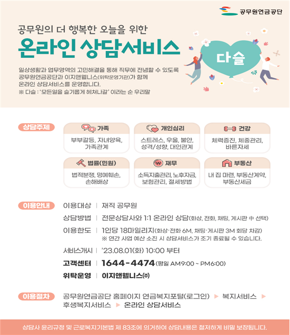 | 공무원연금공단은 공무원들의 일상생활과 업무영역의 고민을 원스톱으로 해결하기 위해 공무원 온라인 종합 상담서비스 “다슬”을 8월 1일(화) 부터 운영한다.